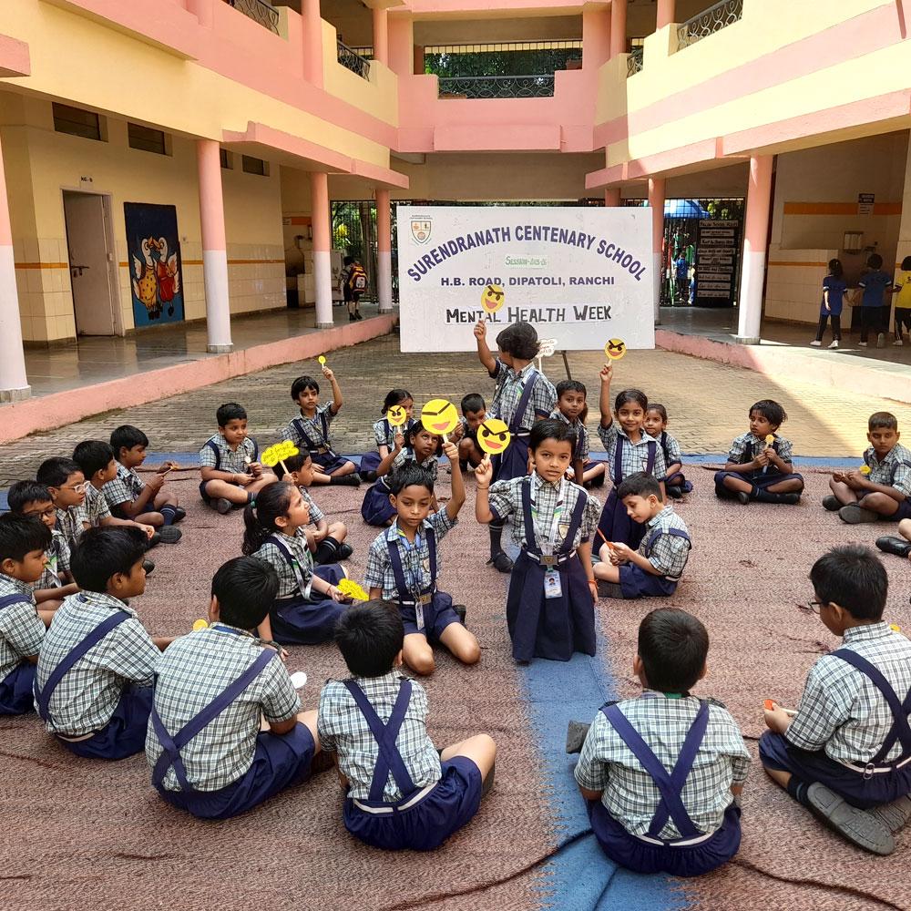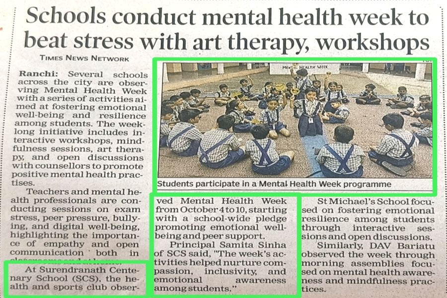 The Health and Sports Club of Surendranath Centenary School observed Mental Health Week from October 4th to 10th, focusing on promoting mental well-being among students. The week began with a school-wide pledge in the morning assembly, emphasizing the importance of mental health and encouraging students to prioritize their emotional well-being. In the junior wing, activities included meditation and yoga sessions for students of classes I, IV, and V, and a painting competition for class III students to express emotions through emojis. Circle Time for Balvatika students facilitated sharing feelings with peers, while classes IV and V contributed to a Gratitude Wall. A health talk, Happy Mind, Healthy Me, was conducted by the school counsellor for class II students. In the senior wing, a motivational speech was delivered in the assembly emphasizing the importance of developing mental well-being. A workshop and interactive session was organized for class 8 students which addressed parental pressure, communication gaps, and fear of judgment. As part of the observance, SCS provided a platform for specially abled children from Deepsikha, an institute for child development and mental health, to showcase their talents and connect with the community through stalls featuring Diwali-themed handmade items. Madam Principal Samita Sinha appreciated the efforts made during Mental Health Week, saying it had fostered a sense of community feeling and empathy among students, promoting mental well-being.